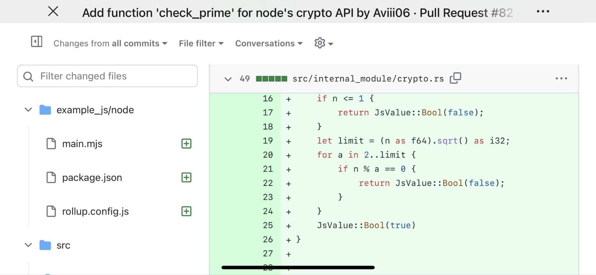하지만 ChatGPT/4가 코드 리뷰를 수행할 만큼 똑똑할까요? 이것은 시니어 개발자가 해야 할 일 아닌가요? 더 이상 고민하지 않고 예시를 살펴보겠습니다. 아래 그림은 WasmEdge 오픈 소스 리포지토리 중 하나에 제출된 PR을 보여줍니다. 입력된 숫자가 소수인지 확인하기 위해 check_prime() 함수를 추가합니다. 구현은 꽤 표준적으로 보입니다. 2에서 n의 제곱근까지 반복하고 모든 정수에 대해 분할 가능성을 확인합니다.