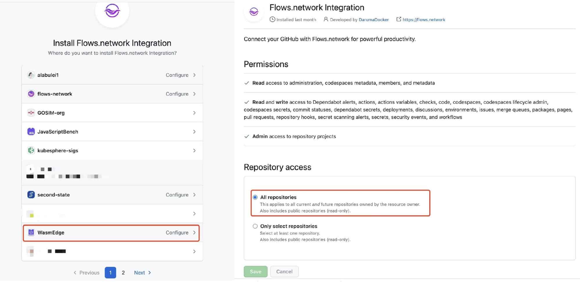 하나의 저장소에서 봇을 성공적으로 실행한 후에는 모든 저장소에 대해 코드 검토를 하고 싶을 것입니다! 물론 각 저장소에 대해 템플릿에서 별도의 봇을 배포할 수 있습니다. 그러나 이는 각 봇마다 관리해야 할 소스 코드가 따로 있다는 의미이며, 관리가 어려워질 수 있습니다. 동일한 봇 소스 코드를 사용하여 여러 봇을 만들 수 있습니다! flows.network에서는 각 봇을 " flow"라고 부릅니다.