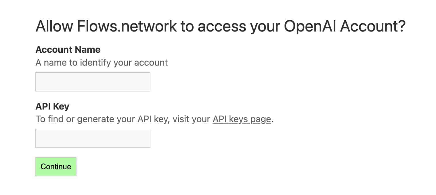 마지막으로, 봇( flow)에 OpenAI API 키와 봇을 배포할 대상 GitHub 리포지토리에 대한 액세스 권한을 부여하는 프로세스를 거치게 됩니다.