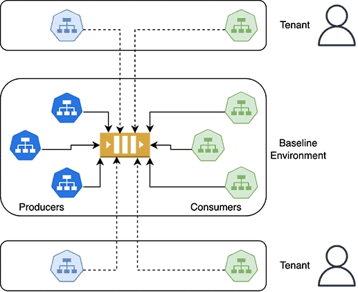 테넌트 간에 완전한 격리를 원하는 경우, 모든 프로듀서와 컨슈머를 포함하여 각 테넌트에 대해 새로운 Kafka 클러스터를 생성하도록 선택할 수 있습니다. 그러나 이 접근 방식은 특히 많은 서비스와 함께 리소스 집약적인 Kafka 클러스터가 있는 경우 관리가 어려울 수 있습니다. 메인 브랜치에 병합된 변경 사항으로 각 환경을 최신 상태로 유지하는 자동화가 없다면, 이러한 환경은 빠르게 구식이 될 수 있으며 유지 관리에 상당한 노력이 필요할 수 있습니다.