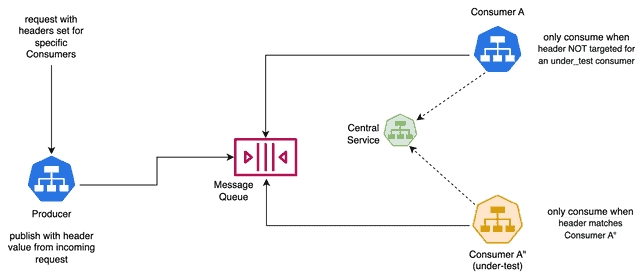 이 접근 방식에서는 Kafka와 프로듀서 및 컨슈머를 포함한 모든 서비스를 포함하는 "기준" 환경을 설정합니다. 이 기준선은 선택한 CI/CD 도구를 사용하여 지속적으로 업데이트되는 사전 프로덕션 환경일 수 있습니다. 모든 테넌트가 이 기준선을 공유합니다. 각 테넌트는 "테스트 중" 서비스 집합에 대한 매핑을 가지고 있습니다. 테넌트를 서로 격리하기 위해 요청 및 메시지의 동적 라우팅을 활용합니다. OpenTelemetry를 사용하여 헤더에 태그를 지정하고 서비스 및 Kafka를 통해 전파합니다. 그런 다음 요청과 메시지는 이러한 헤더 값에 따라 특정 서비스로 동적으로 라우팅됩니다.