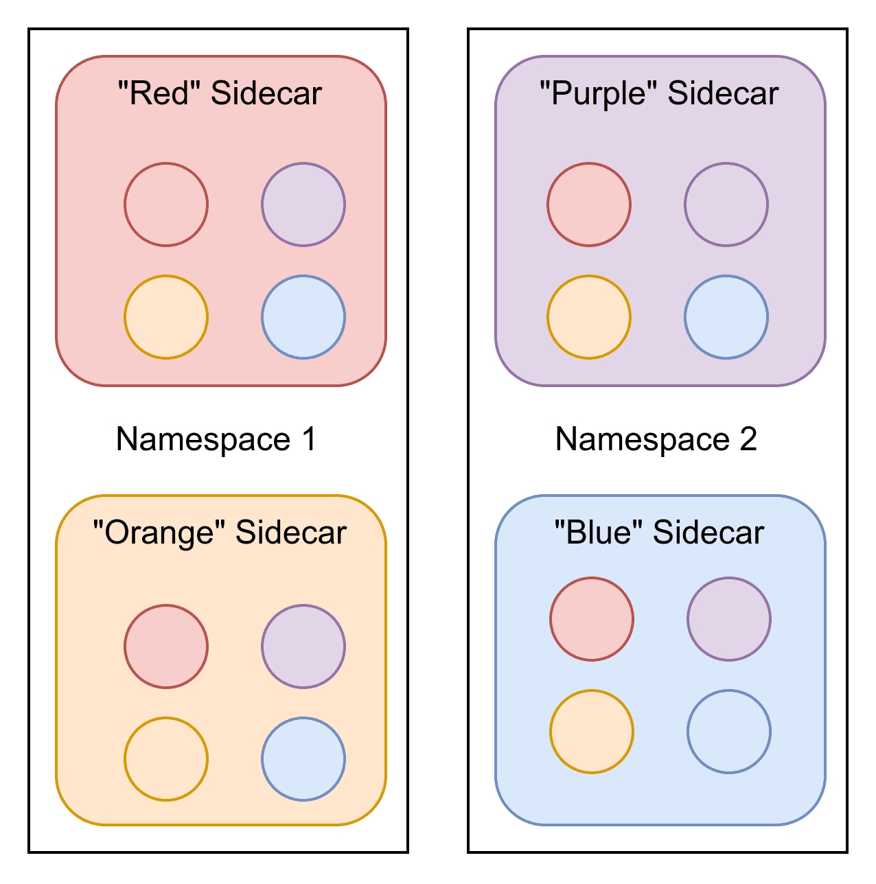 네임스페이스가 2개이고 각각 색으로 구분된 배포가 2개씩 있는 간단한 배포를 생각해 봅시다. 사이드카를 프로그래밍하는 데 필요한 Envoy(XDS) 구성은 원으로 표시되어 있습니다: